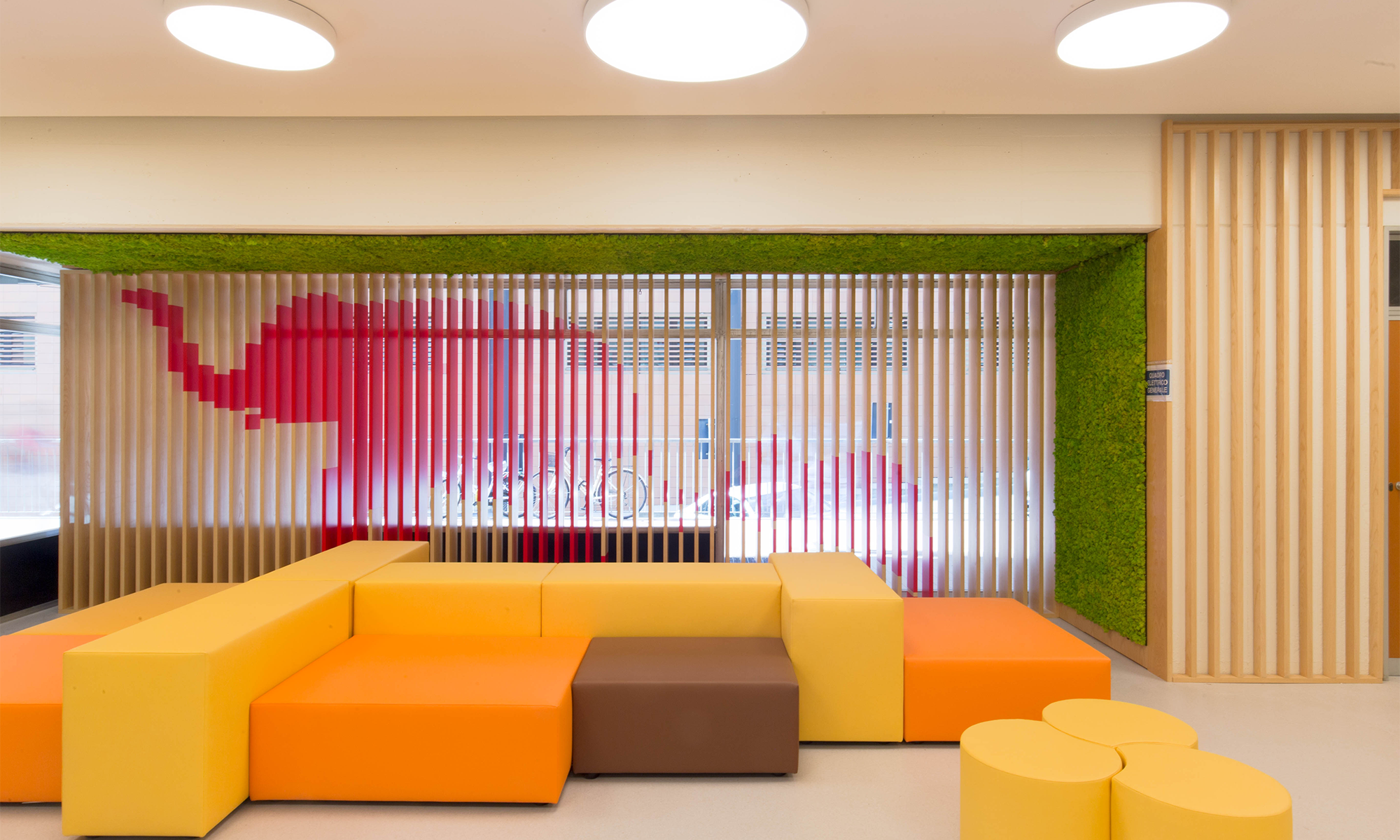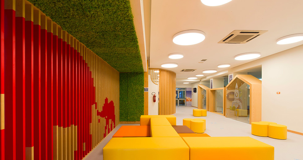 L’area oggi è un luogo dove colori, materiali, elementi di arredo lavorano insieme sinergicamente creando un’atmosfera speciale tutta rivolta al benessere dei giovani ospiti che la vivono.