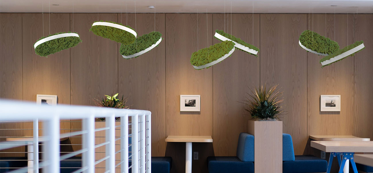 Our green design solution for interiors in 3 words: modular, sound-absorbing and customizable. Within the line, it is possible to choose from 3 products in stabilized moss with different installation possibilities: ceiling-mounted, floor-mounted, and desk-mounted.
