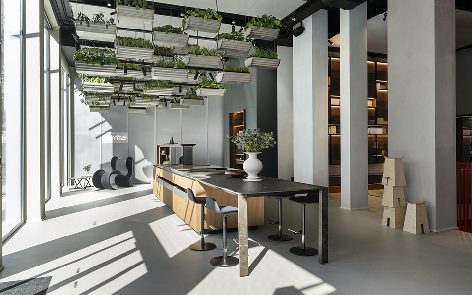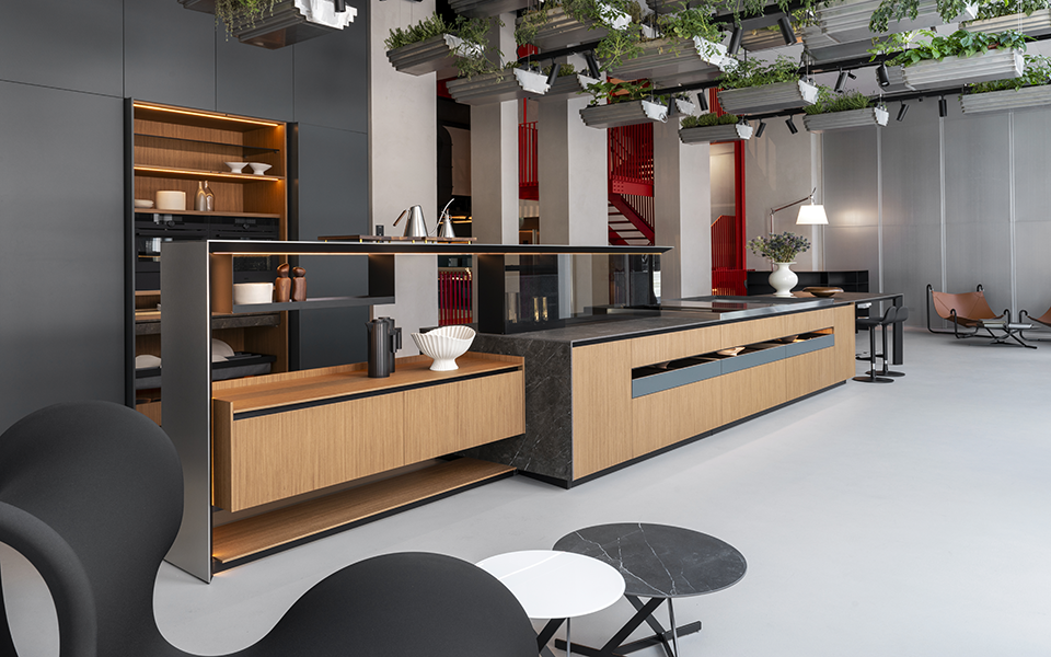 The project reflects the brand’s essence — innovation and quality — resulting in an immersive showroom where nature and kitchen design coexist in perfect harmony.