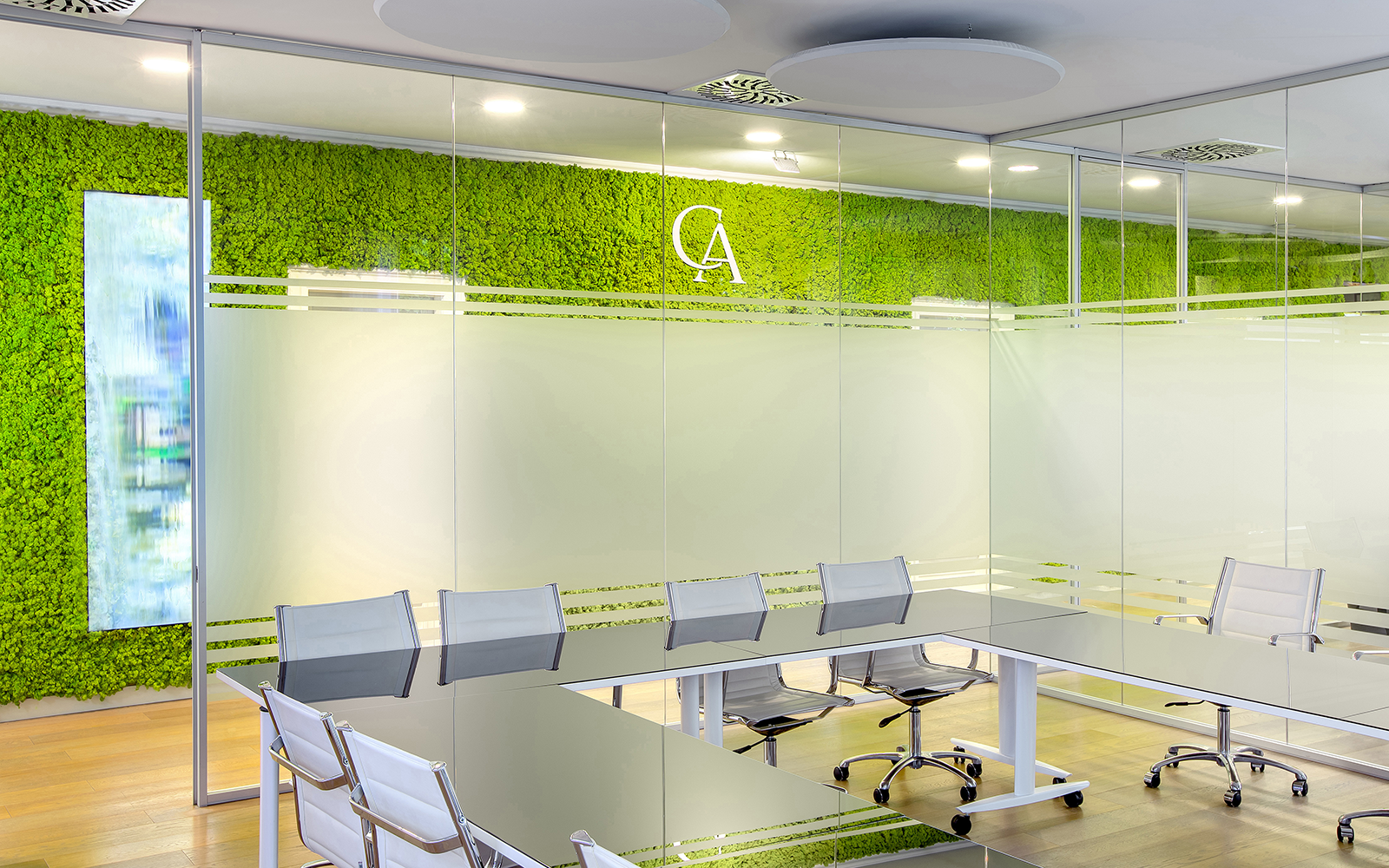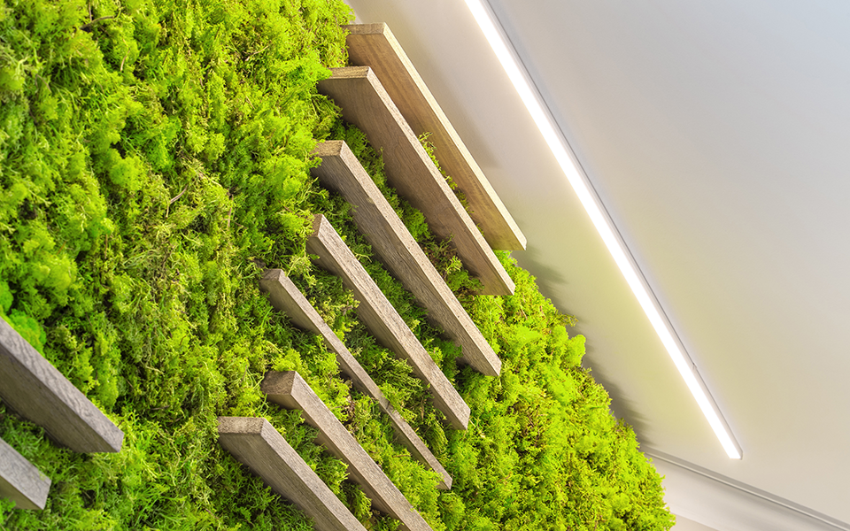 In the executive office, a MOSSwall® Strips wall was installed instead: a perfect combination of linearity and nature, where the irregular shape of the moss blends with the wooden slats.