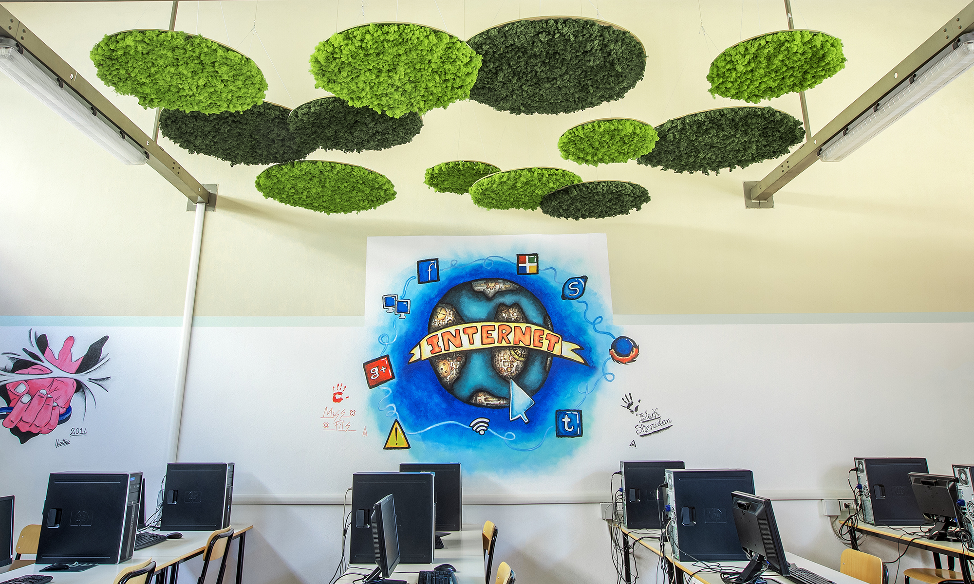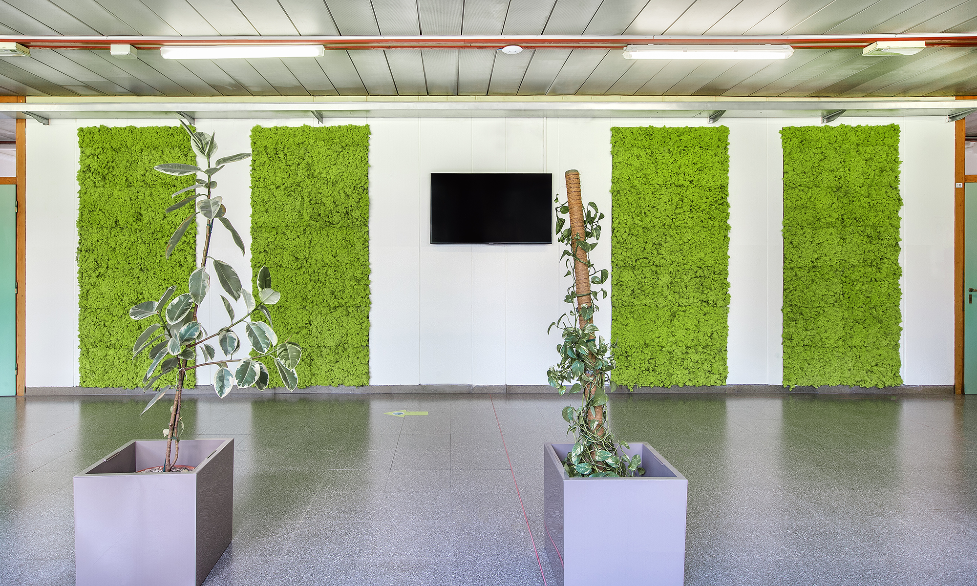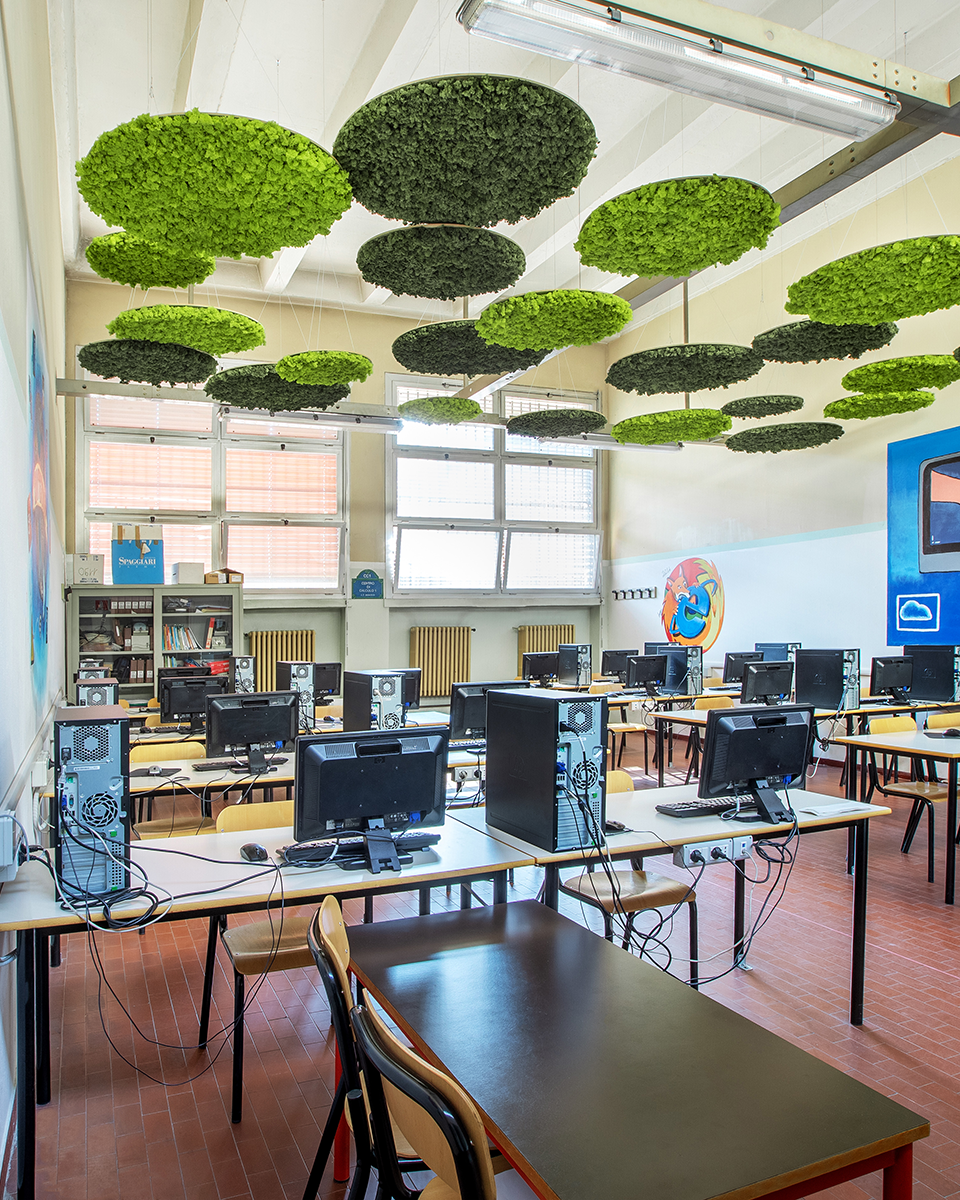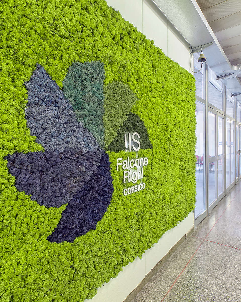 The Falcone Righi Institute in Corsico chose MOSSwall®, a harmonious blend of nature and design, to enhance its educational spaces. The stabilized moss helps absorb background noise while reducing stress and anxiety among students. Exposure to natural elements has been shown to improve attention and behavior during learning. The green walls enliven corridors and laboratories, combining aesthetics with functionality. A lichen wall can also personalize specific areas with distinctive style and character. In the main atrium, a wasabi-colored wall featuring the school’s logo—also made of stabilized moss—creates a striking visual centerpiece. The result is a creative installation that reinforces the school’s identity, beauty, and overall sense of well-being.