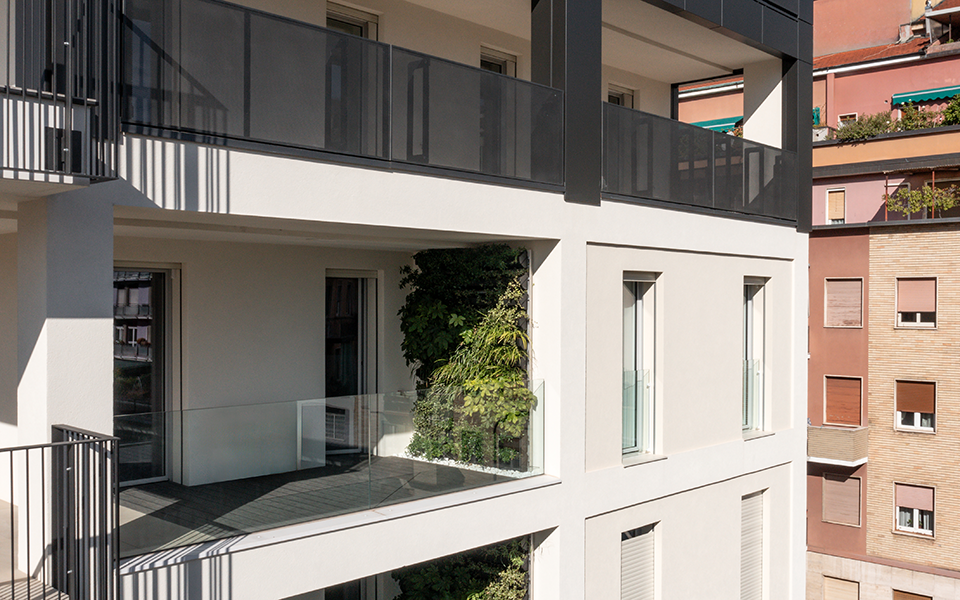 The multiplicity of green façades overlooking the courtyard generates welcoming outdoor lounges—true suspended living rooms—that extend the interiors and are distinguished by their dedicated materials and finishes.