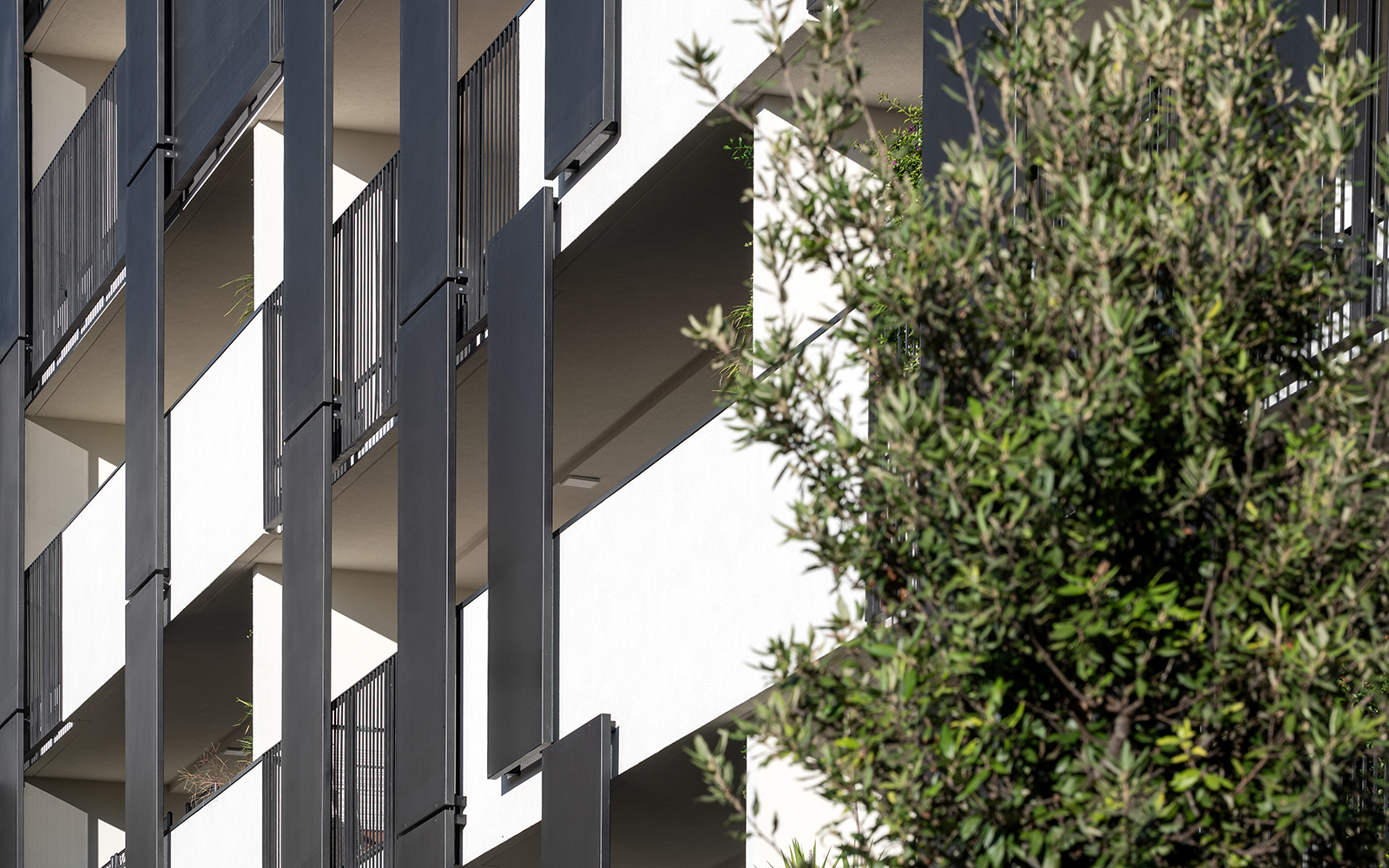 These private vertical gardens, always visible from inside the apartments, engage in dialogue with the shared horizontal courtyard garden, helping to create a cohesive and lively landscape.