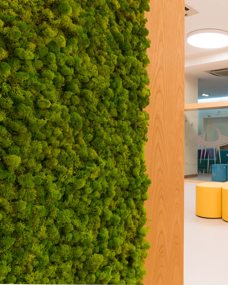 San Matteo Hospital in Pavia — one of the most innovative hospitals to integrate nature as an architectural element supporting patient healing — chose MOSSwall® stabilized moss by VerdeProfilo®.
