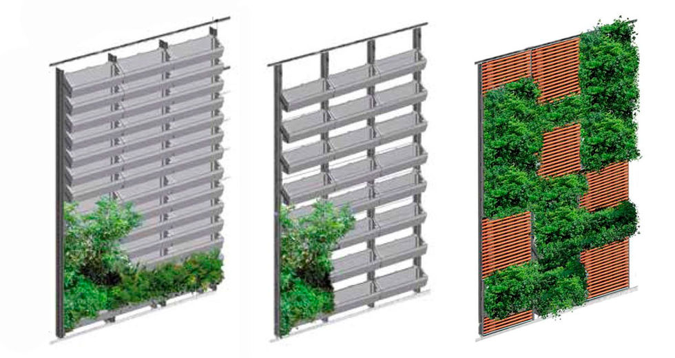I layout strutturali per giardini verticali outdoor sono molteplici, grazie al libero posizionamento del modulo nella struttura e a seconda delle necessità del cliente possiamo tarare la quantità di moduli sulla facciata, realizzando giardini verticali a totale, parziale o bassa copertura.