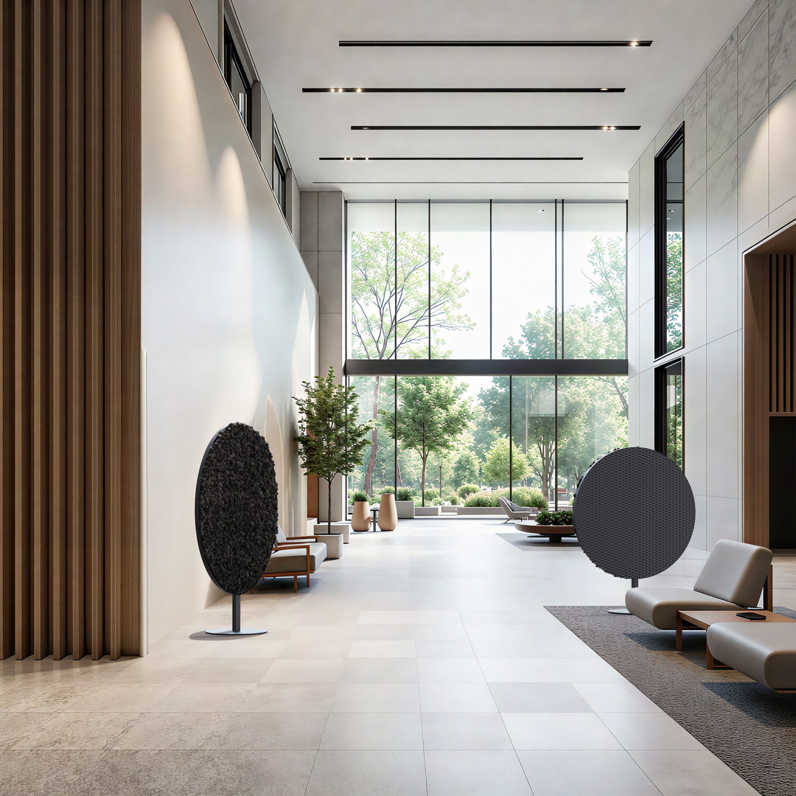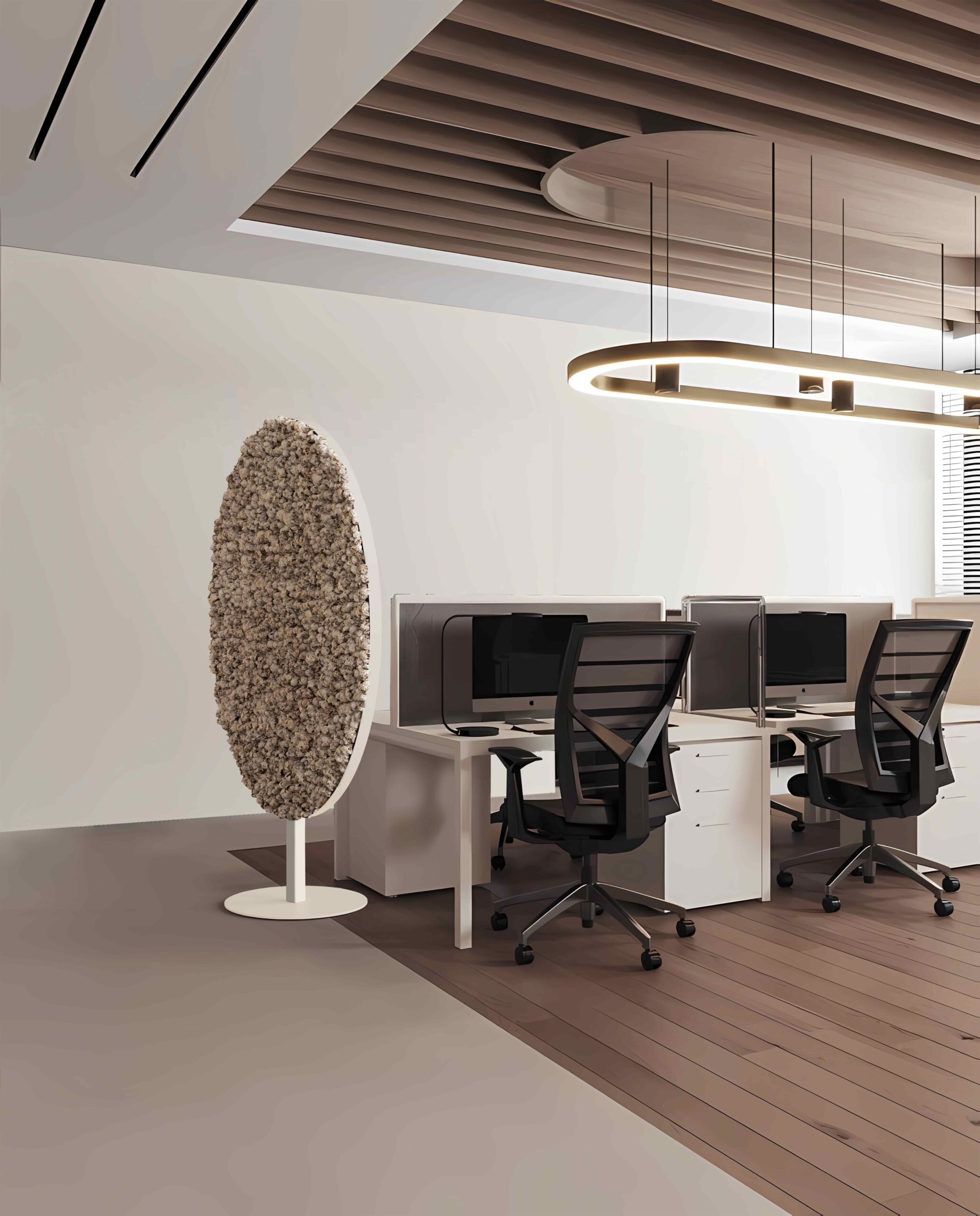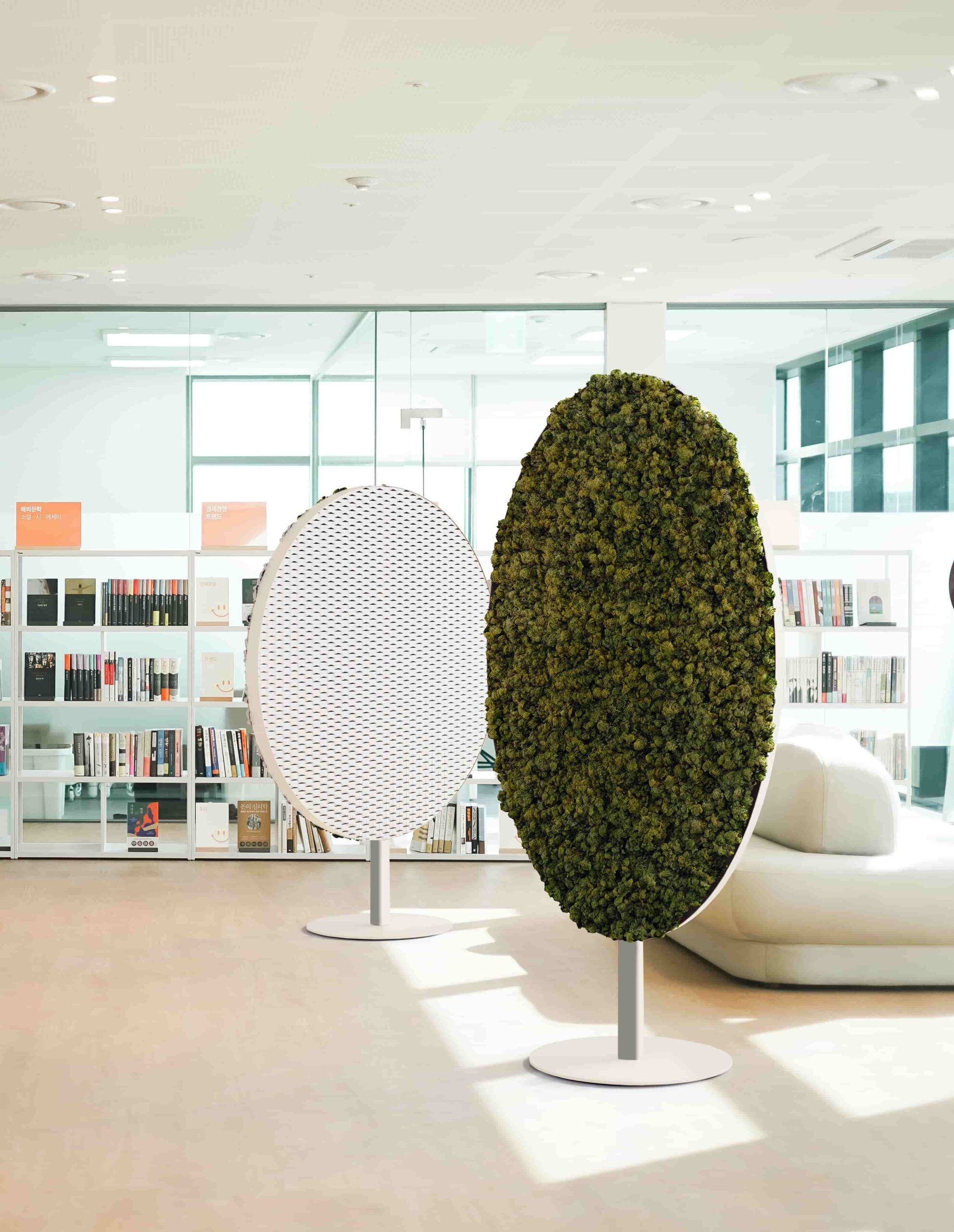Mast è un divisorio pensato principalmente per gli spazi ufficio, che svolge una funzione fonoassorbente, ma allo stesso tempo arricchisce l’ambiente con un elemento verde dovuto al muschio, applicato su un lato del divisorio.
