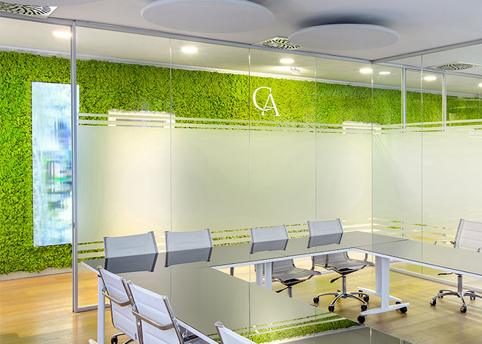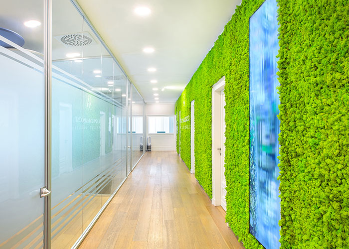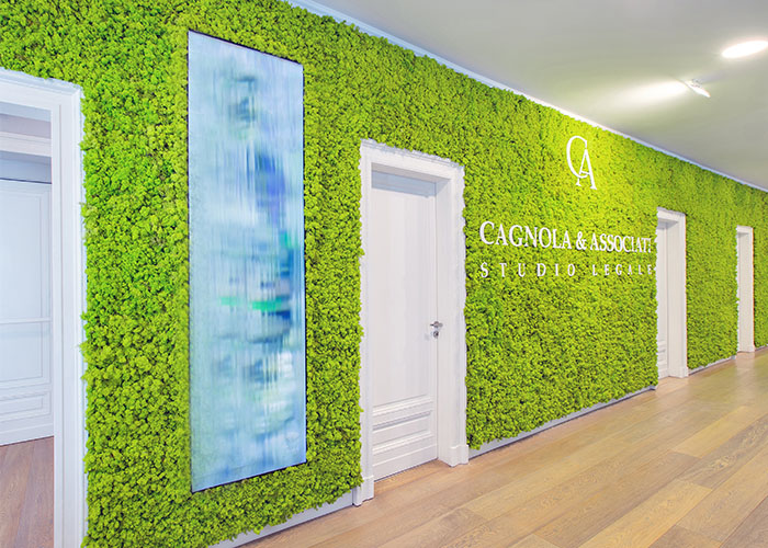 La parete in muschio stabilizzato è stata la scelta perfetta per ravvivare il corridoio che collega i vari uffici di questo Studio legale e per dare un nuovo tocco decorativo.