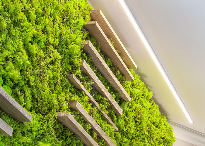 Nell'ufficio dirigenziale è stata invece allestita una parete di MOSSwall® Strips: un perfetto connubio tra linearità e natura, dove la forma irregolare del muschio converge con le listarelle di legno.