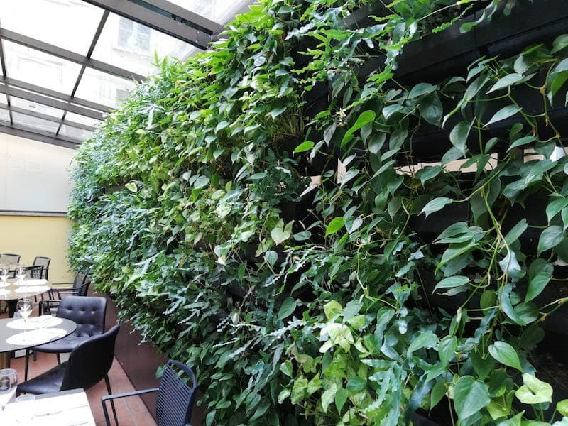 Il giardino verticale è composto da Phlebodium fern blue, Syngonium podophillum e Philodendron scandens.