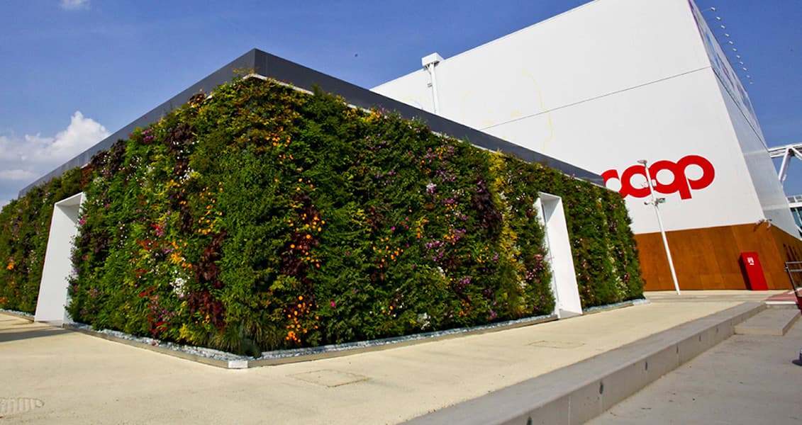 COOP ha scelto Verde Profilo per il rivestimento di 4 temporary shop nella piazza centrale di EXPO. Il sistema utilizzato con VP-HYDRO ha permesso un pronto effetto e unop spessore contenuto.