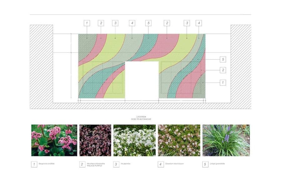Il progetto botanico comprende l’uso di 5 essenze diverse: Bergenia Cordifolia, Heuchera Micracantha, Iris Japonica, Geranium Macrorizzum, Liriope graminifolia.