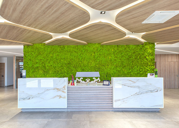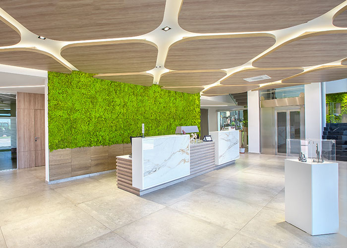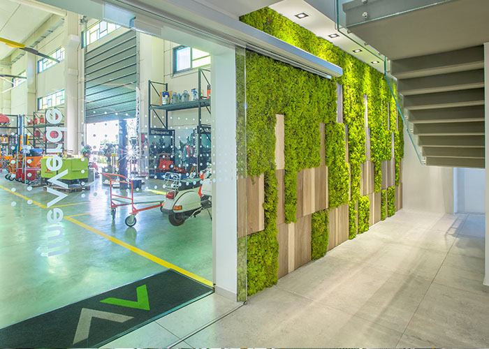 Il progetto di restyling ha coinvolto diverse zone della sede aziendale di Napoli. In particolare all'ingresso è stata allestita una parete di muschio stabilizzato MOSSwall Boiserie dietro al bancone della reception; parete che funge anche da parete divisoria dividendo lo spazio d'accoglienza e gli uffici.