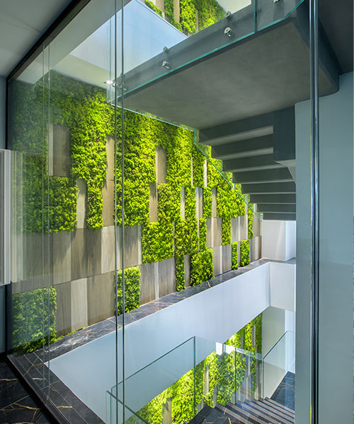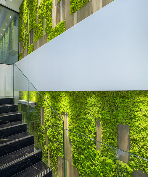 Ogni piano invece è caratterizzato da una parete di MOSSwall Boiserie, ognuna con una composizione di pannelli diversa rispetto alle altre. Le pareti sono visibili percorrendo i vari piani sia con le scale sia con l'ascensore a vetri, creando un effetto scenografico.