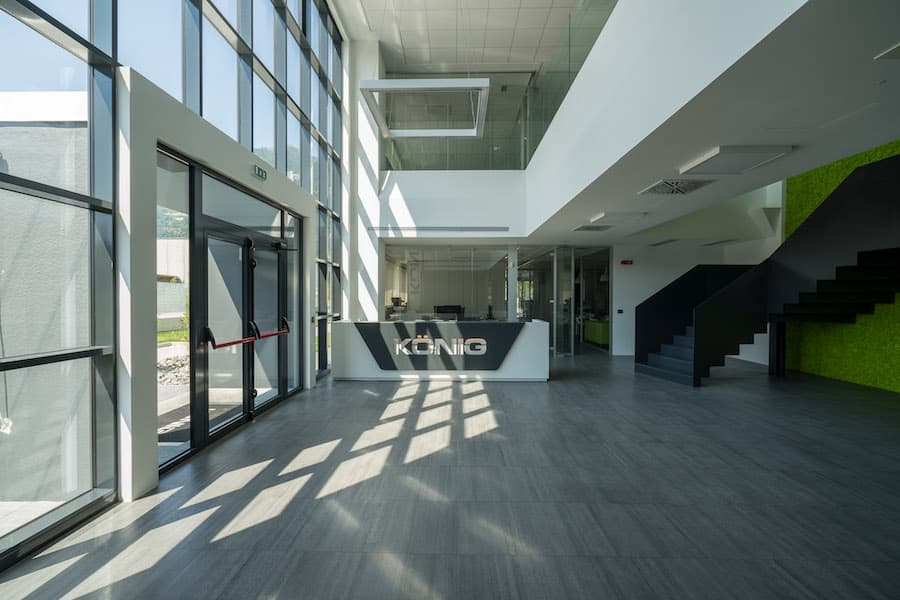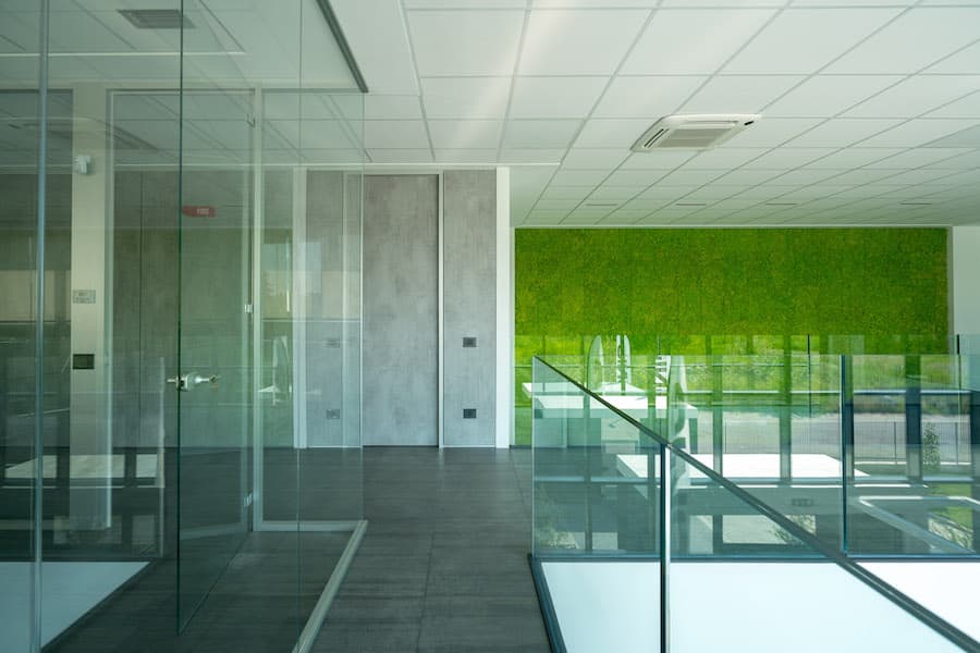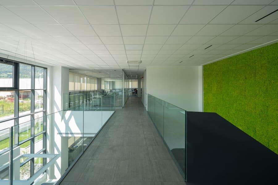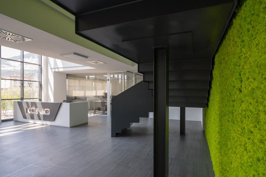 La prima sensazione che si ha all'ingresso è quella di freschezza, una parete interamente in MOSSwall® color wasabi ci accoglie alla porta della sede di Pewag Immobiliare Srl.