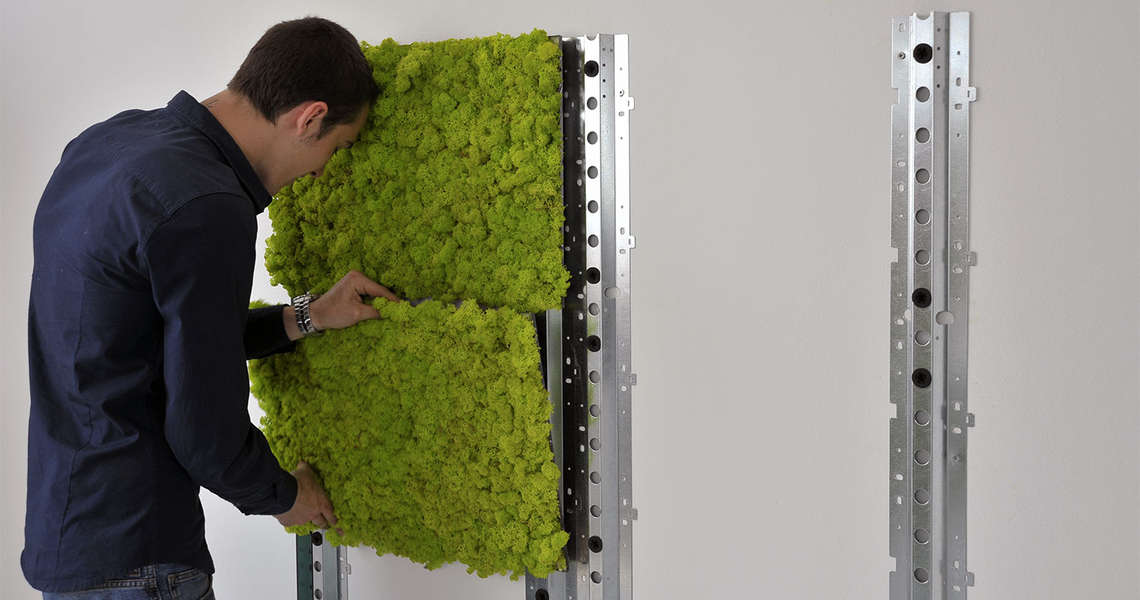 Verde Profilo® ha ingegnerizzato per una migliore facilità e volocità di posa la sottostruttura MOSSwall®, composta da montanti singoli e doppi e da carter laterali di finitura. Il sistema, oltre a rendere più semplice l’installazione di MOSSwall® permette il pasaggio di cavi e tubazioni oltre a permettere una rapida sostituzioni dei pannelli qualora fosse necessario.